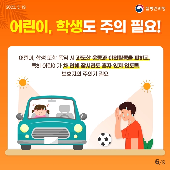 어린이, 학생들은 폭염 시 과도한 운동과 야외활동을 피해야 합니다. 특히 어린이가 차 안에 잠시라도 혼자 있지 않도록 보호자의 주의가 필요합니다.